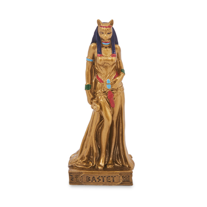 Эта миниатюрная алтарная статуэтка представляет собой изящное воплощение древнеегипетской богини Бастет (или Баст), почитаемой как покровительница плодородия, домашнего очага, радости и веселья. Статуэтка изображает Бастет в ее классическом антропоморфном облике — с грациозным телом женщины и головой кошки, что символизирует ее связь с этими животными, олицетворяющими плодородие и мудрость. Поза богини исполнена спокойствия и достоинства.