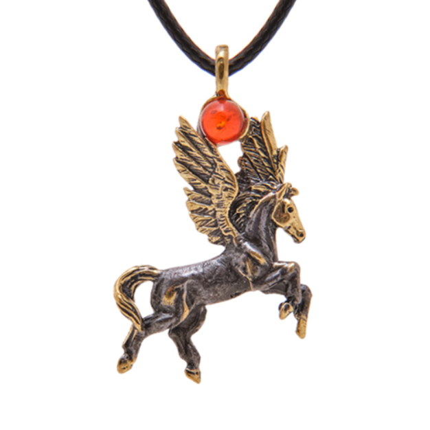 Подвеска представляет собой стилизованное изображение Пегаса в момент отрыва от земли. Пегас - благородный крылатый конь из древнегреческих легенд. Рожденный из морской пены и крови Медузы Горгоны, Пегас был верным спутником героев и муз, символом возвышенной мысли, вдохновения и полета души, преодолевающего любые преграды. Чистые линии и обобщённые формы латунной фигурки подчёркивают стремительность и грацию мифического существа.