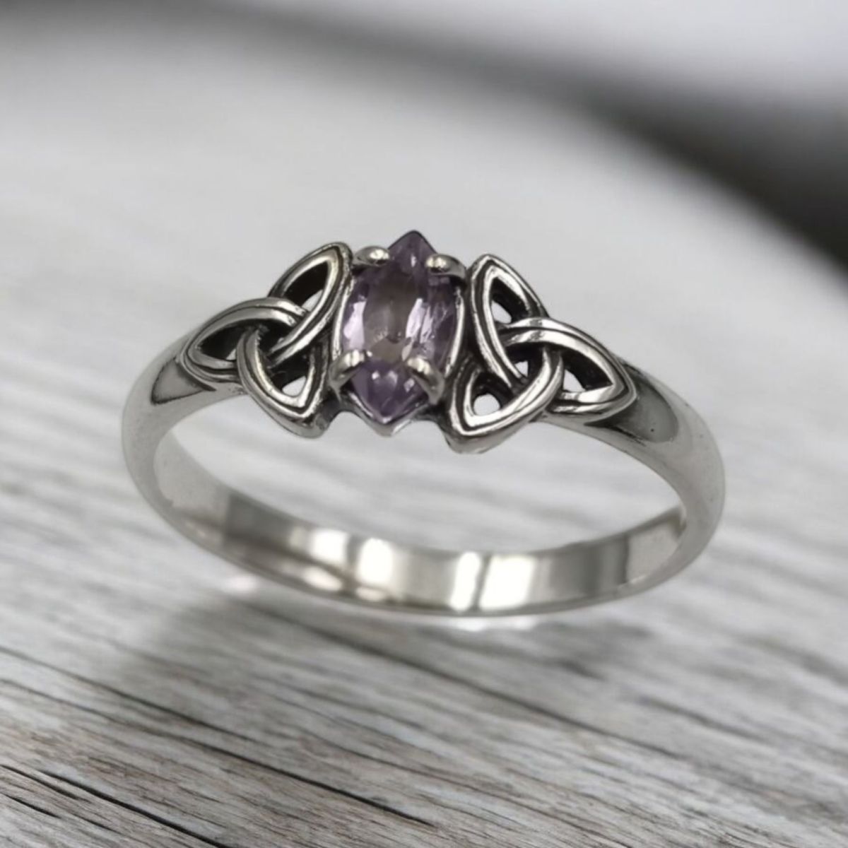 Ширина кольца в центральной части - 6 мм. Ширина шинки - 2,5 мм. Вес кольца из серебра 1,5 гр. Вставка - натуральный аметист формы маркиз 5 х 3 мм.