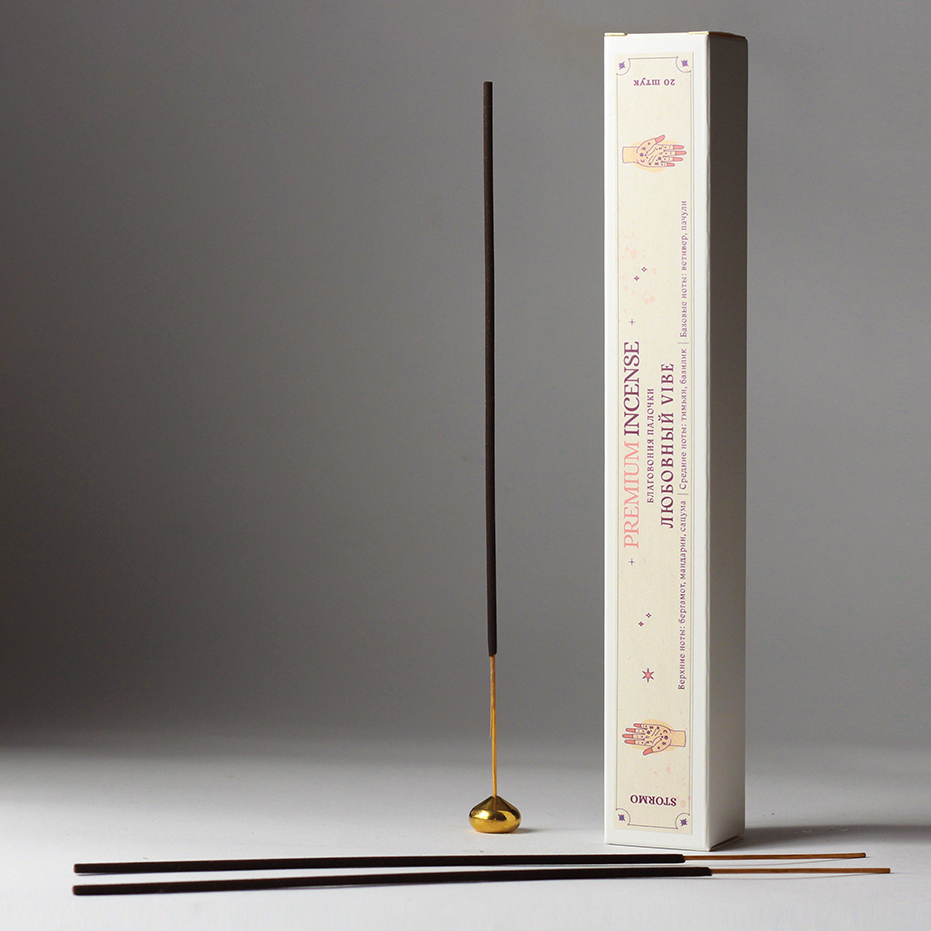 "Любовный vibe” — это аромат про романтику, нежность и внутреннее сияние. Он открывается искрящимися нотами бергамота, мандарина и сацумы, напоминая о первых эмоциях влюблённости. Сердце композиции — травянистый дуэт тимьяна и базилика, создающий особую гармонию. А в базе — пряный, тёплый шлейф из ветивера и пачули. Благовония подойдут для романтических вечеров, уютных ритуалов ухода и медитаций на принятие себя. Упакованы в элегантную белую коробку без подставки.