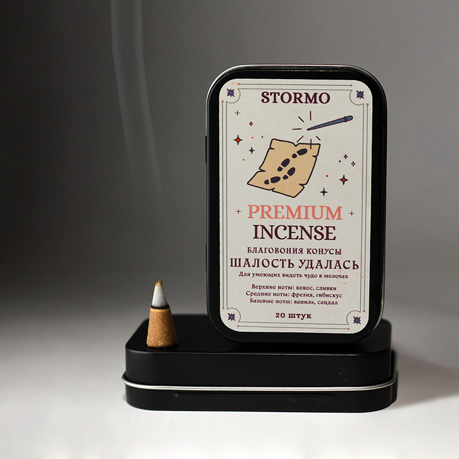 Ароматические конусы Stormo «Шалость удалась» созданы для лёгкого игривого настроения и умения замечать чудо в мелочах. Нежная сладость кокоса и сливок переходит в цветочную свежесть фрезии и гибискуса, а мягкий аккорд ванили и сандала завершает композицию, создавая уютное и обволакивающее настроение. Идеальны для медитаций, вечеров с друзьями или атмосферного фона для работы и отдыха.