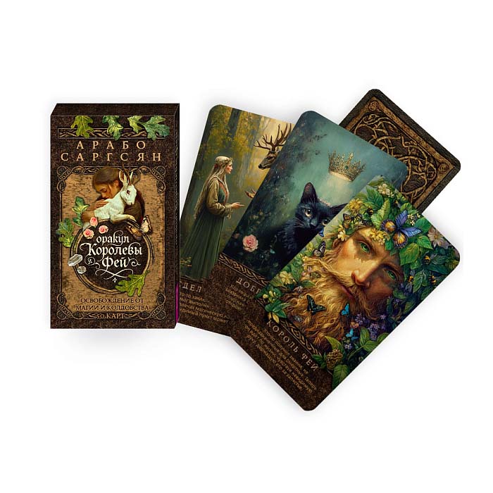 Не у всех есть возможность получить поддержку мастеров, практиков, тех, кто чувствует тонкий мир. В этом случае обнаружить и устранить чужое воздействие поможет новый оракул Арабо Саргсяна. Он был создан как навигатор по миру фейри — месту, где переплетаются мифы, магия и архетипы. Внутри колоды собраны ключевые фигуры и образы фейской традиции (Король фей, Дикая Охота, подменыш, угощение фей и др.). Освещаются темы фейской крови, магических печатей, скрытых порталов и следов, которые фейри могут оставить на судьбе человека. Каждая карта — это послание. Оно не всегда очевидно, но интуиция и внимание к деталям помогут его истолковать.
