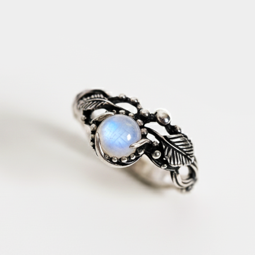 В центре этого миниатюрного шедевра, словно сама луна в кроне дерева, сияет лунный камень. Его молочно-белая или прозрачная поверхность переливается мягким голубым сиянием. Этот таинственный мерцающий минерал напоминает о магии ночи, тишине и загадочных снах.