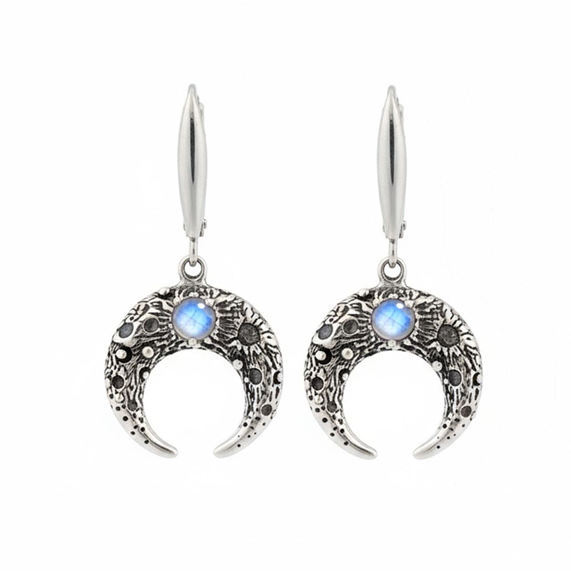 В центре каждой серьги сияет главный элемент — лунный камень. Его мерцающая, глубокая поверхность с внутренним голубовато-серебристым свечением идеально дополняет загадочный рельеф.