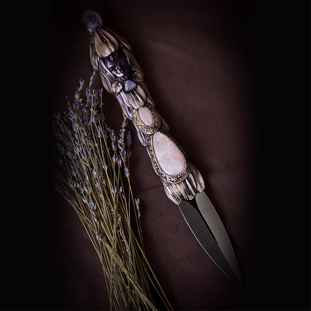 Навершие и рукоять — это душа и сердце инструмента. В их основе лежит аметист — магический кристалл высшей чистоты. Он не вставлен, а будто вырос из самой рукояти, холодным фиолетовым пламенем вобравшим в себя мудрость глубин и ясность горных вершин. Аметист служит фильтром и трансформатором: рассеивает хаос мысли, оберегает дух оператора от чуждых влияний и настраивает всё существо на частоту высших намерений. Вокруг этого царственного сердца, в причудливом узоре, сплетаются иные дети Земли. Каждый камень — живой, дышащий союзник.