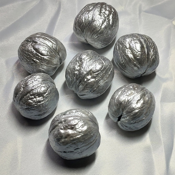 Это изящный новогодний декор ручной работы, сделанный с любовью из натуральной скорлупы грецкого ореха. Каждый орешек бережно обработан, а затем покрашен в искрящийся перламутровый цвет, который красиво переливается в свете гирлянд и свечей.