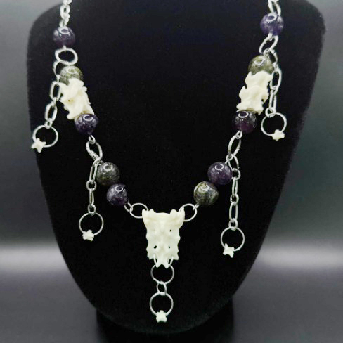 Яшма (Земля) — ваш якорь в материальном мире. Этот камень прочно удерживает вас «здесь и сейчас», даёт чувство стабильности, телесной силы и уверенности под ногами. Он не позволяет духовным поискам превратиться в оторванные от жизни фантазии, помогая воплощать идеи в реальность. Аметист (Небо/Дух) — ваш мост к высшим сферам. Он открывает канал для тонкой интуиции, высшего знания и внутреннего покоя, способствуя связи с духовными наставниками и собственным высшим «Я». Его энергия приносит ясность ума и умиротворение, необходимое для медитации и озарений. Позвонки животных — символический хребет, соединяющий миры. Эти природные элементы олицетворяют единство всех уровней бытия — инстинктивного, материального и духовного. Они напоминают, что тело и дух неразделимы, и мудрость природы ведёт к целостности.